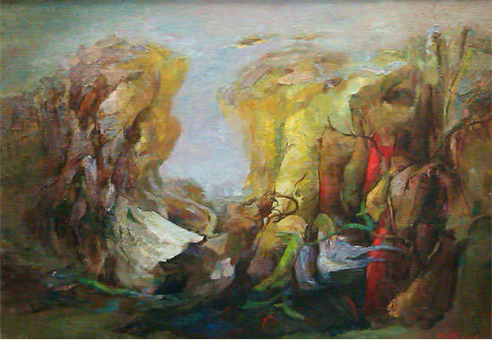 张希斌先生的油画充满了幻觉与想象的张力。给人以独出机杼,别具慧眼,融汇了智慧与灵感,画别人所未画或不能画之感。 解读他的画作《缘》、《裂变》、《创世纪》、《探询》等,首先感到他对东西方油画创作传统技法的自觉消解和超越,品赏他的作品需要有猜谜那样的耐心,他的作品犹如一泓深水,一眼是望不到底的。因为他是灵魂的画家,灵感的歌者,行走在与众不同的创作范式道路上。
